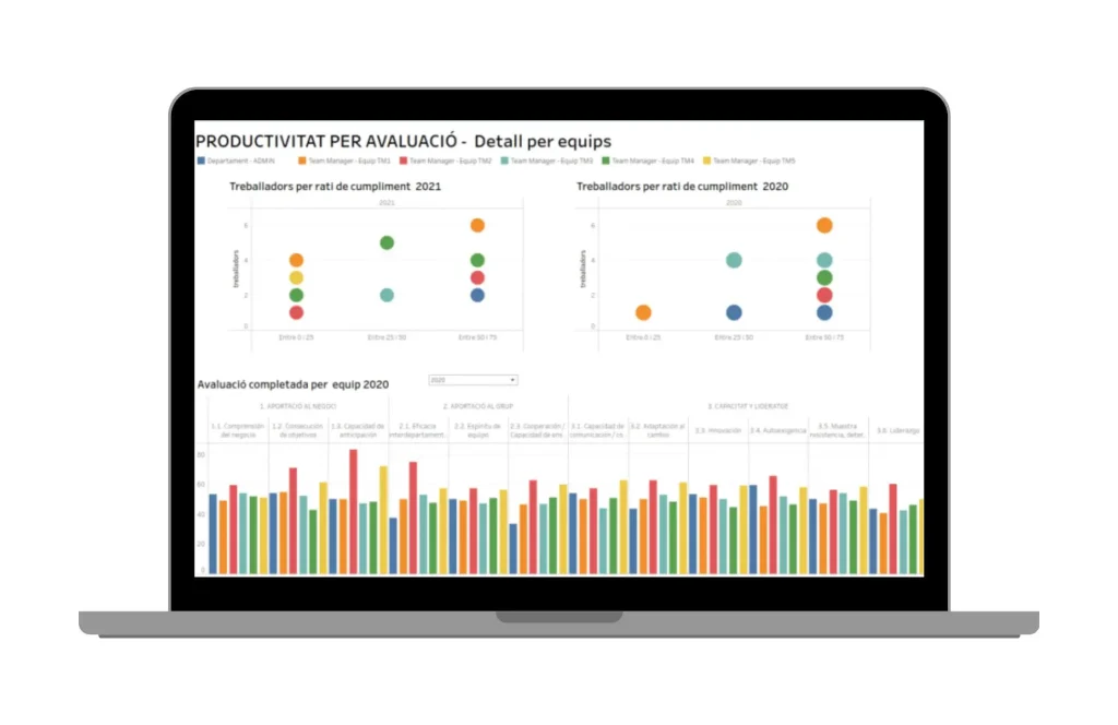 Este panel de indicadores va ligado a procesos de evaluación anuales cuyos criterios puede definir cada empresa en su ERP Coneix. Una vez determinado los criterios para cada grupo de equipos, este panel nos mostrará la ponderación total basado en estos criterios.